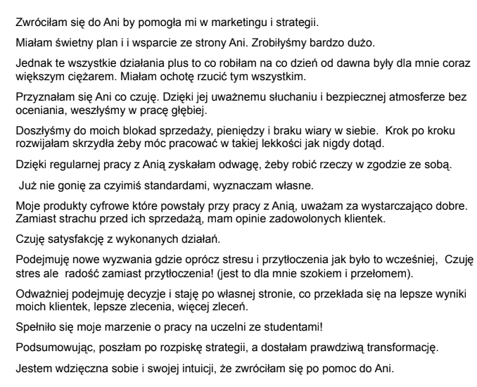 Przez lata próbowałam wyjść z ofertą, ale moja strona www od 2021 roku świeciła pustkami. To, co potrafiłam robić dla klientów, nie potrafiłam zrobić dla siebie. Spędziłam setki godzin pracy mentalnej na warsztatach i indywidualnych spotkaniach.